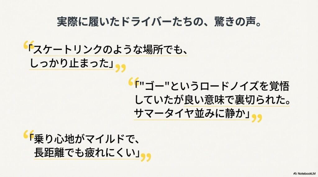 オールシーズンタイヤ特有の「ゴー」というロードノイズを覚悟していたユーザーからは、良い意味で裏切られたという声が上がっています。