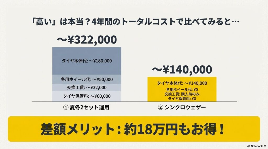 | コスト項目(4年間) | ① 夏冬2セット運用 (保管サービス利用) | ② シンクロウェザー (1セット運用) |