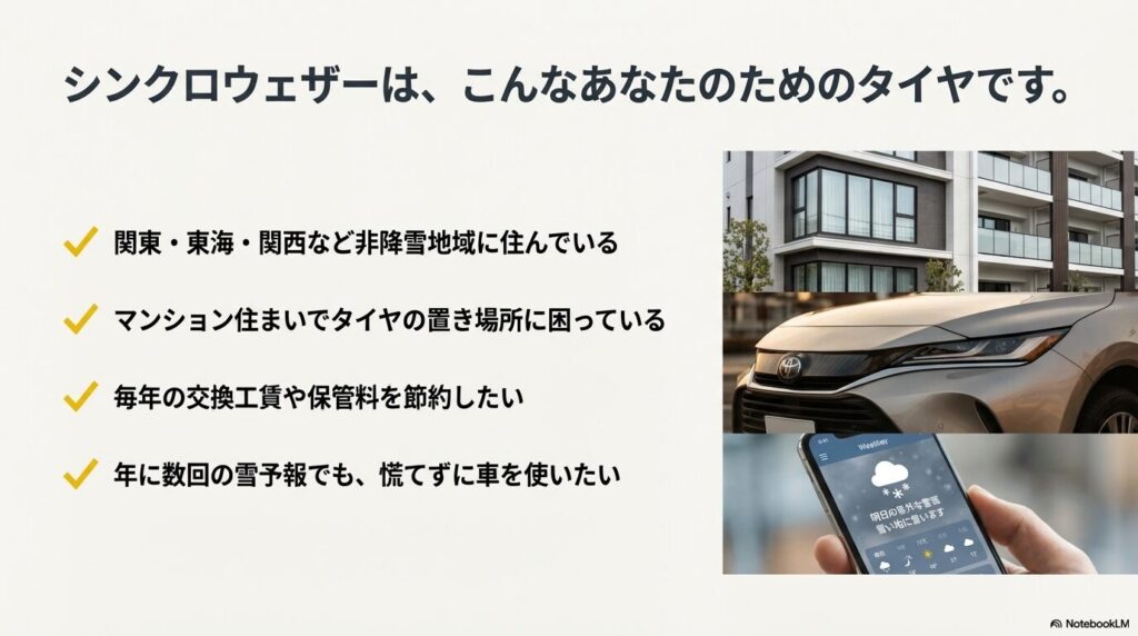 シンクロウェザーはあくまで「非降雪地域のユーザーが、急な雪や凍結に遭っても安全に帰れる最強のお守り」だと考えるのが正解です。