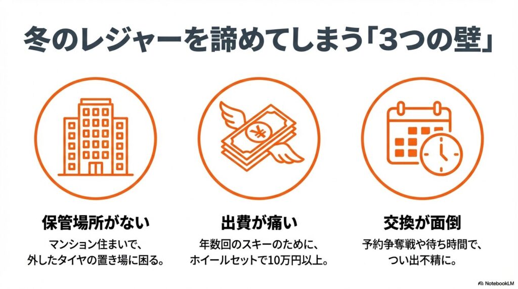 特に関東や東海エリアに住んでいると、スタッドレスタイヤへの履き替えについて、以下のような壁にぶつかりがちです。