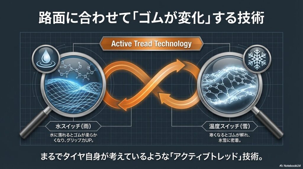 なぜ「冬も夏も」これほど高性能なのか。その秘密は、ダンロップ独自の材料技術「アクティブトレッド」にあります。
