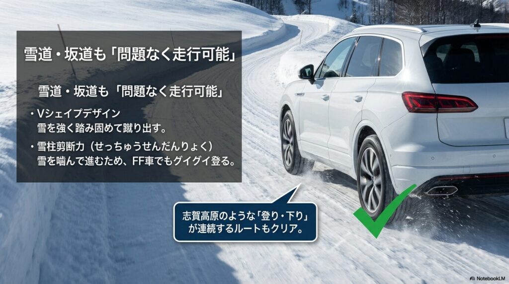 FF車(前輪駆動)や軽自動車であっても、雪をグイグイ噛んで登っていくトラクション性能が確認されています。