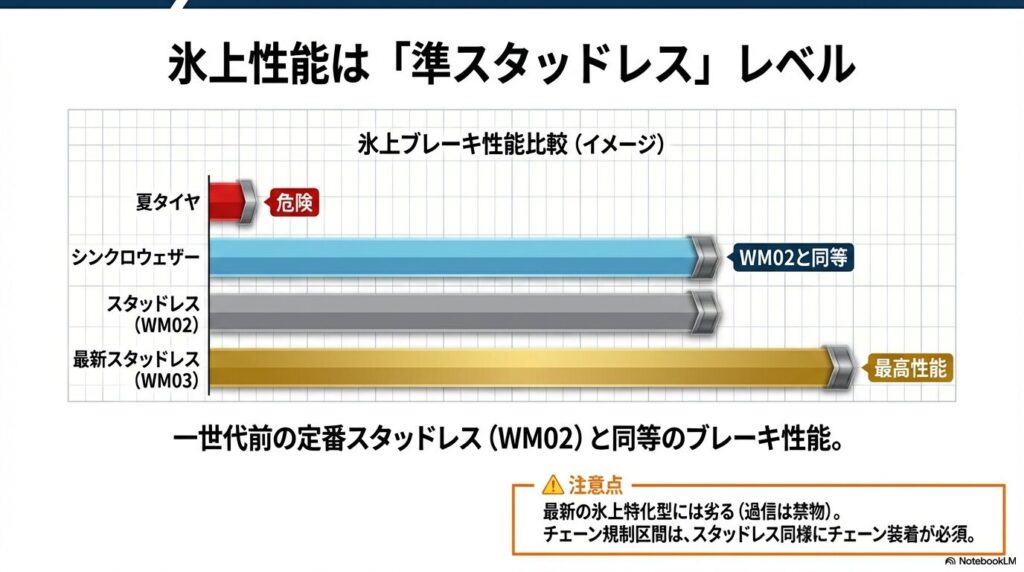ダンロップの公式テストデータによると、シンクロウェザーの氷上ブレーキ性能は驚くべき結果を示しています。