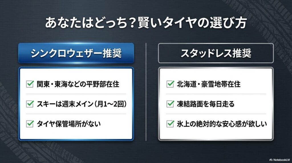 最終的に、あなたが選ぶべきは「シンクロウェザー」か「スタッドレス」か。ライフスタイルに合わせて判断しましょう。
