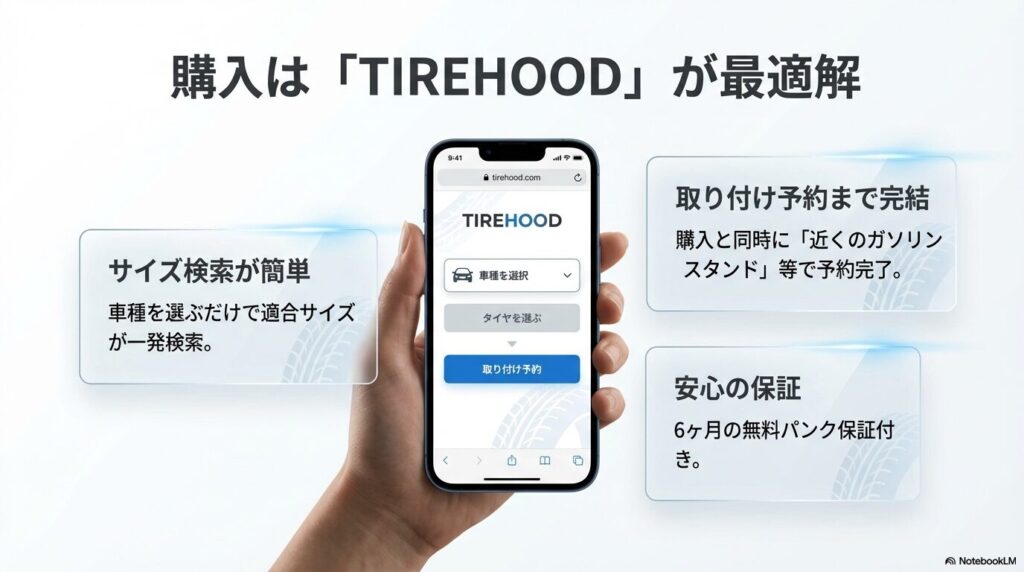 • 購入は、在庫が豊富で取り付け予約も簡単な「タイヤフッド」がおすすめ。