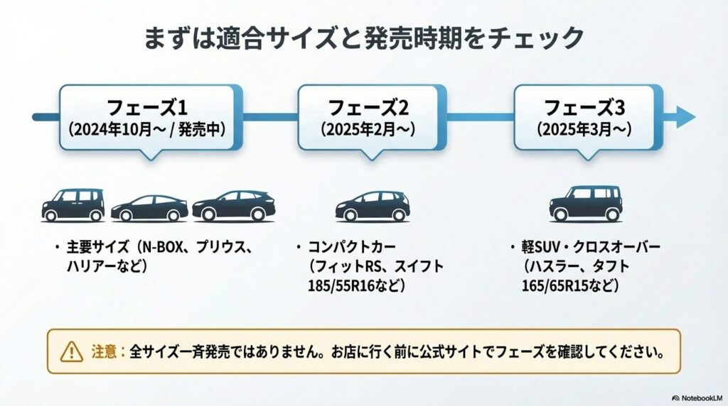 | フェーズ1 | 2024年10月〜 (発売中) | 主要サイズ ・N-BOX(155/65R14) ・プリウス(195/65R15) ・ハリアー(SUVサイズ)など |