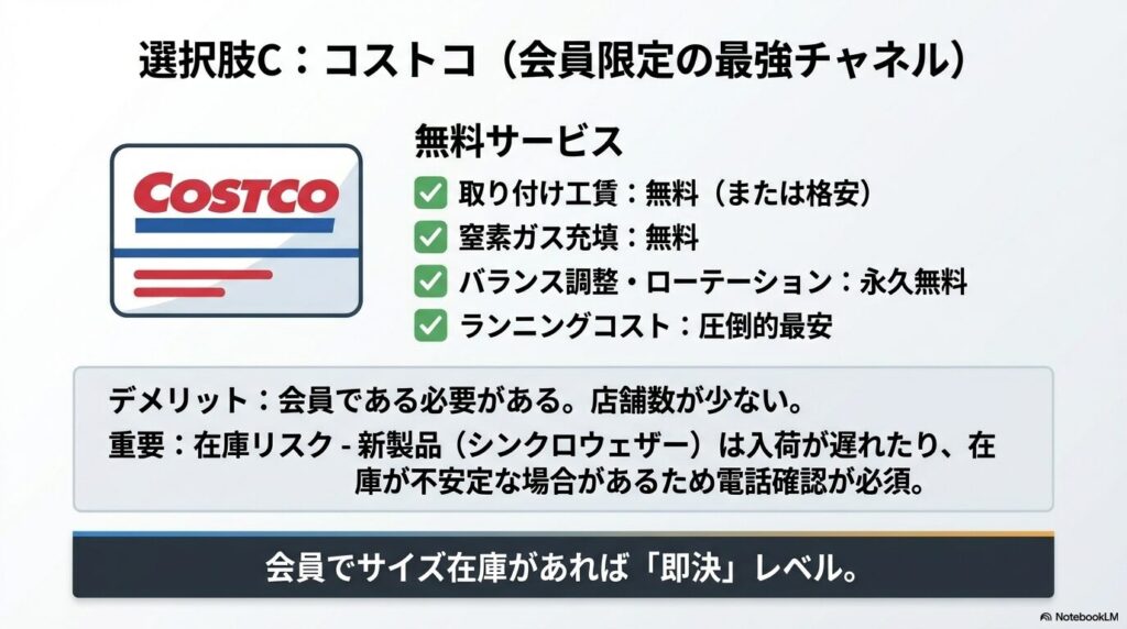 会員制倉庫店のコストコは、タイヤ購入における「隠れた最強チャネル」の一つです。もし会員であれば、以下の特典が受けられます。
