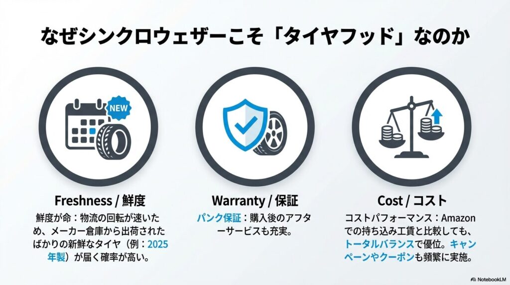 今回は、話題の全天候型タイヤ「シンクロウェザー」の購入先について、様々な角度から調査してきました。最後に、各購入方法のメリット・デメリットをまとめます。