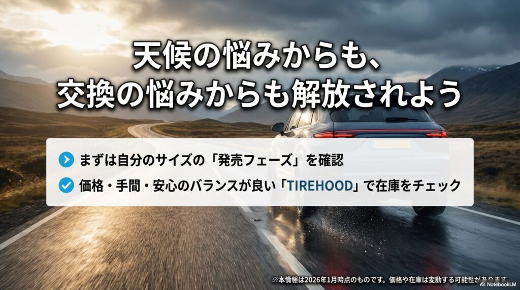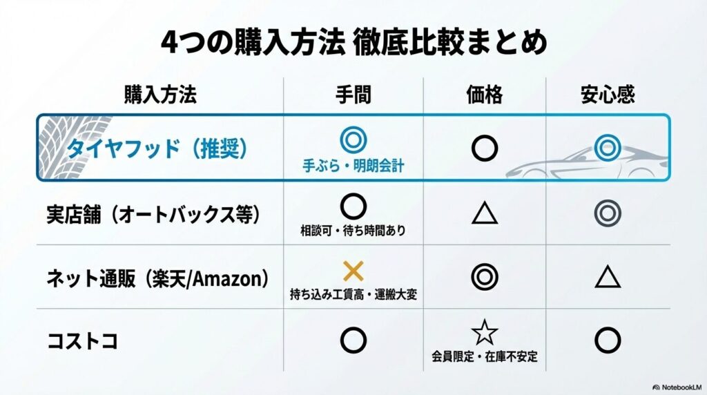 結論として、価格・手間・安心感のバランスを考えると、TIREHOOD(タイヤフッド)経由での購入が最も賢い選択だと言えます。