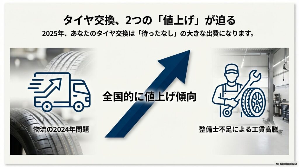 「物流の2024年問題」や「整備士不足」の影響で、タイヤ交換の工賃相場が全国的に値上げ傾向にあります。