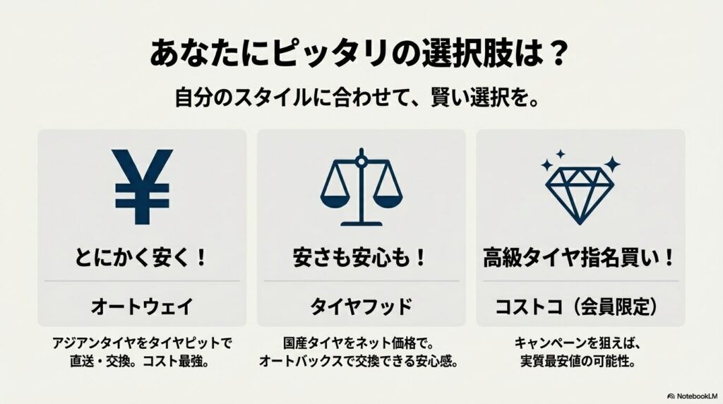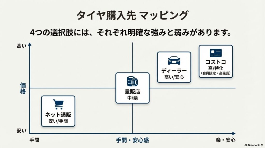 「タイヤを買うならどこが安いのか」という疑問は、単に商品価格だけでなく、交換工賃や持ち込みの手間まで含めた「トータルコスト」で考えなければ正解が見えません。