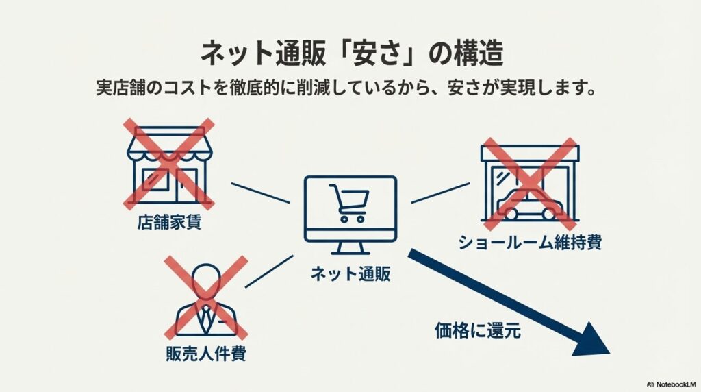 実店舗を持たず、巨大な倉庫から直接ユーザー(または取付店)に配送するため、以下のコストがかかりません。