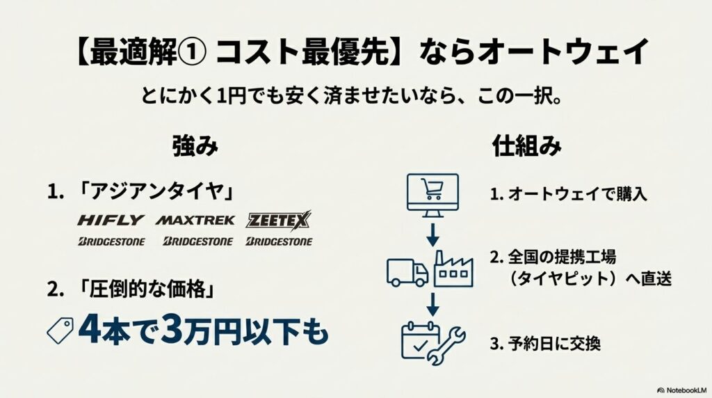 迷わず「オートウェイ」でアジアンタイヤを購入し、タイヤピット加盟店へ直送。これがコスト最強です。