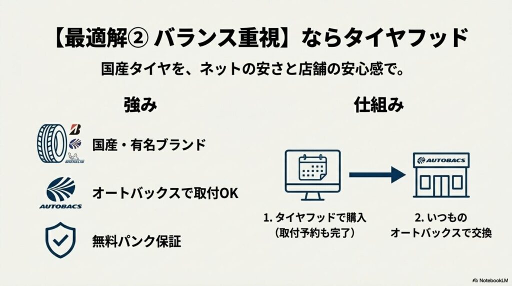 オートウェイが「輸入タイヤ特化の激安モデル」だとすれば、タイヤフッドは「国産・有名ブランドタイヤを、ネット価格で、しかも超簡単に交換できるモデル」です。