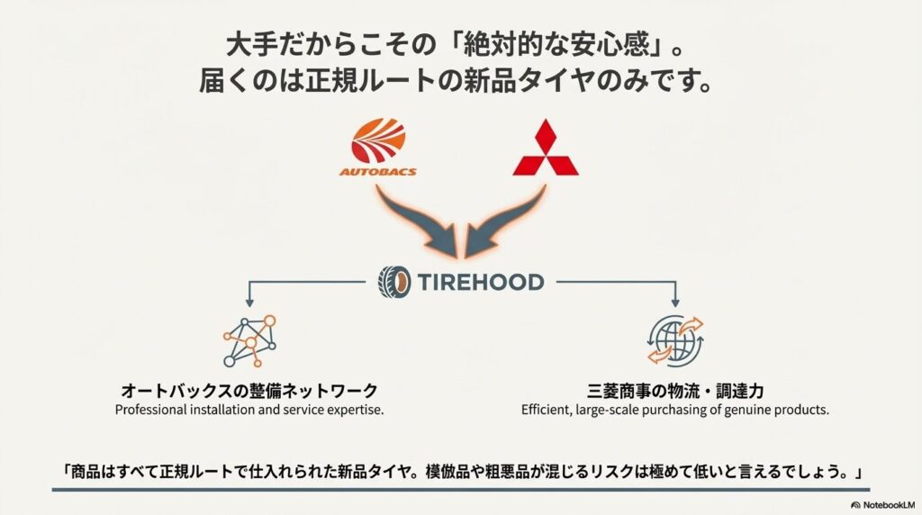 オートバックスの整備ネットワークと、三菱商事の物流・調達力が組み合わさっているため、商品はすべて正規ルートで仕入れられた新品タイヤなので安心です。