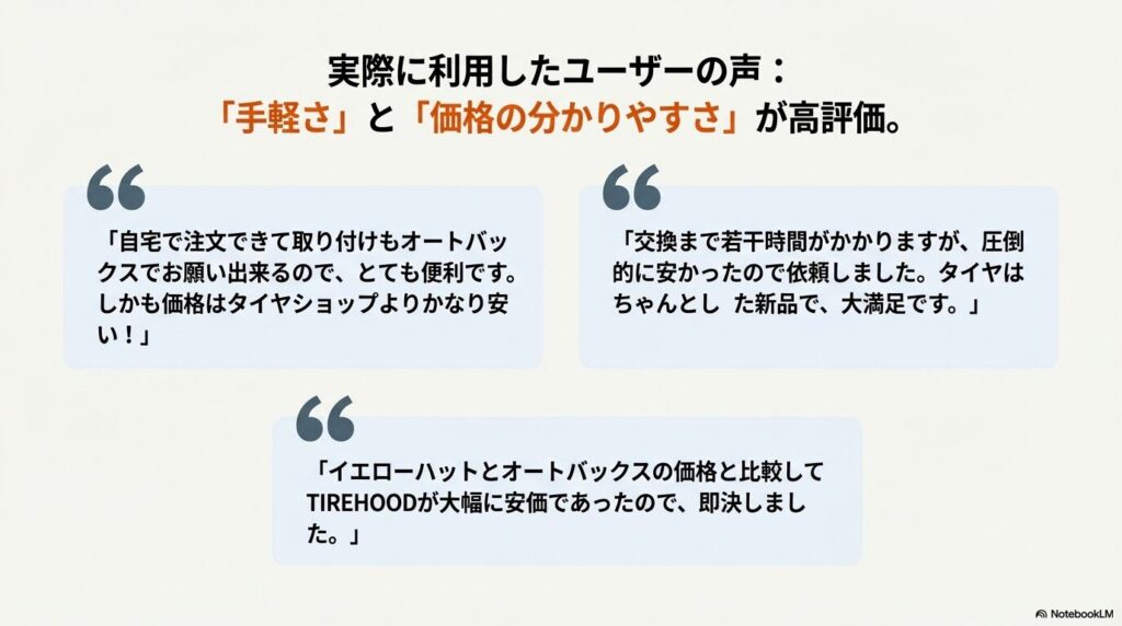 イエローハットとオートバックスの価格と比較してTIREHOODが大幅に安価であったので、即決しました。