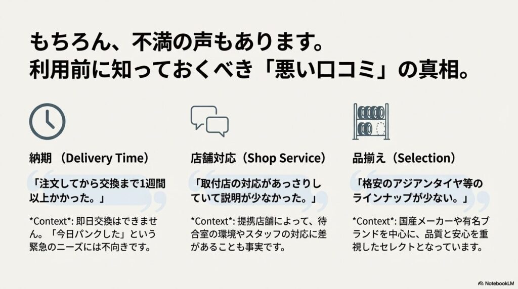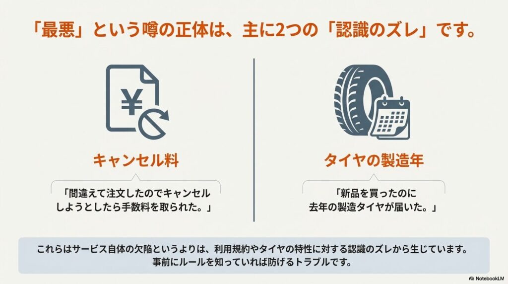 これらはサービス自体の欠陥というよりは、利用規約やタイヤの特性(適正保管なら3年は性能が変わらない)に対する認識のズレから生じている場合がほとんどです。