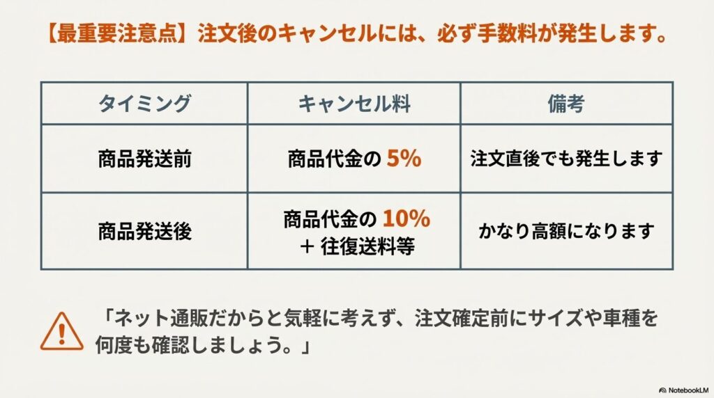 ここは一番の注意点です。タイヤフッドのキャンセルポリシーは厳格に定められています。