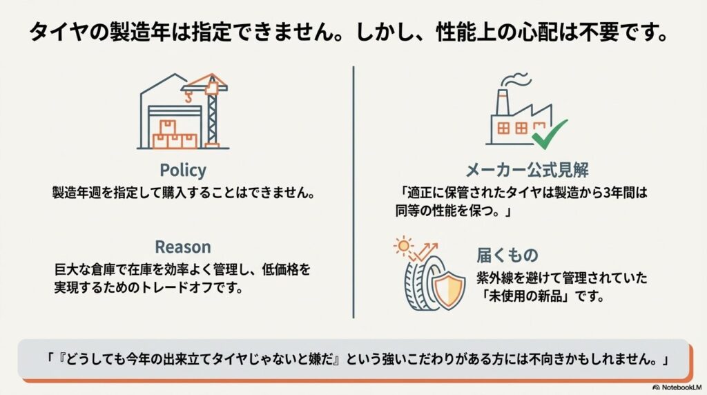 性能上の心配は不要ですが、「どうしても今年の出来立てタイヤじゃないと嫌だ」という強いこだわりがある方には不向きかもしれません。