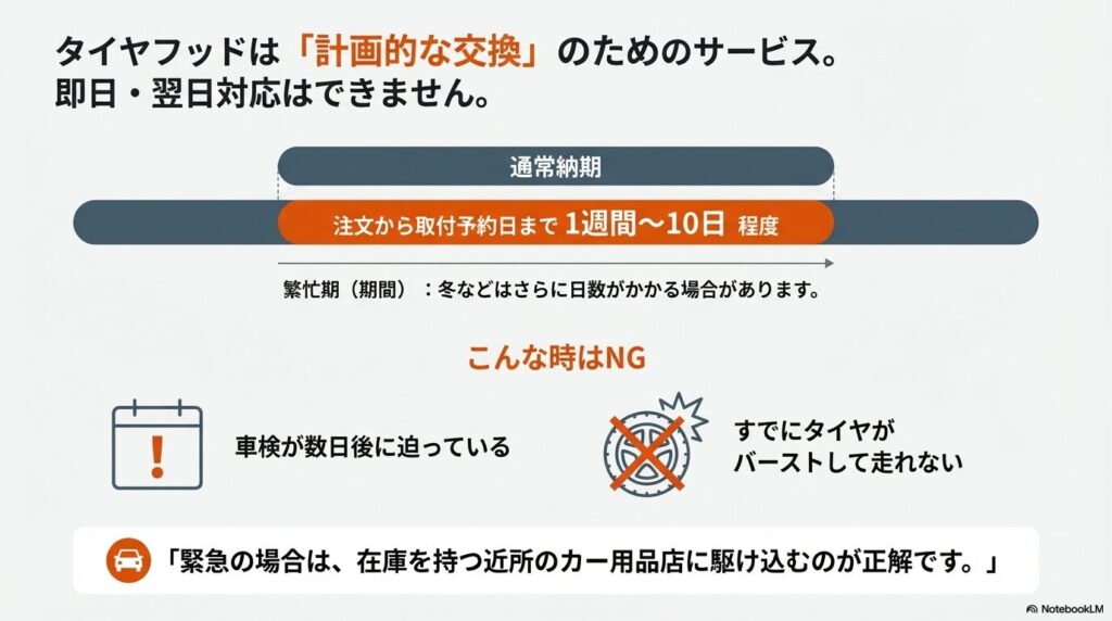 タイヤフッドは注文を受けてから倉庫から配送する仕組みのため、即日交換はできません。「パンクしたから今日直したい」という緊急のニーズには応えられないのが弱点です。