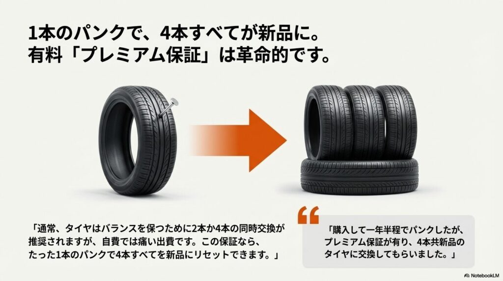 購入して一年半程で、タイヤにタッピングビスが刺さってパンクしたが、2年のプレミアム保証が有り、4本共新品のタイヤに交換してもらいました。