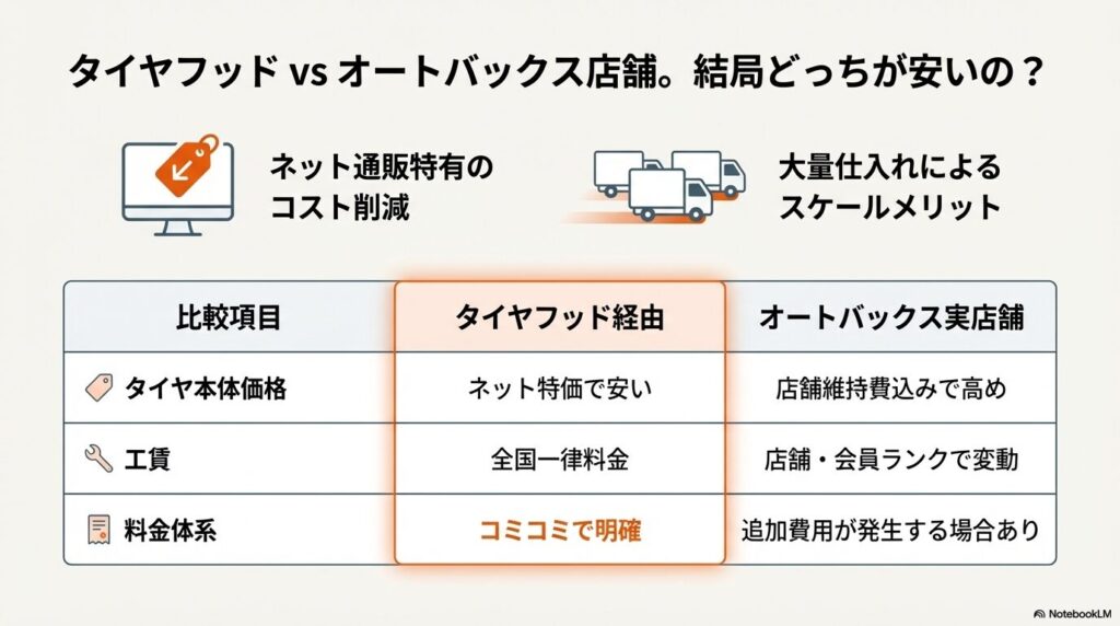 同じオートバックスで取り付けるなら、直接お店で買うのとタイヤフッド経由で買うの、どっちがお得なのでしょうか。