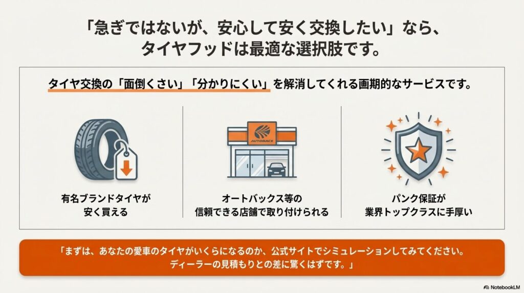 「急ぎではないけれど、安心して安くタイヤ交換を済ませたい」と考えている方にとって、タイヤフッドは間違いなく最適な選択肢の一つです。