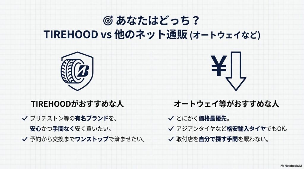 「安さ」ならオートウェイ、「安心と手間なし」ならタイヤフッドという使い分けがおすすめです。