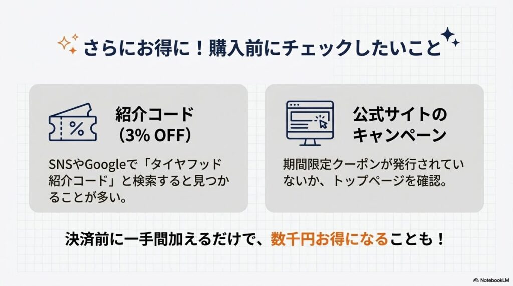 タイヤフッドでは、購入時に利用できるクーポンや紹介コードが存在します。
