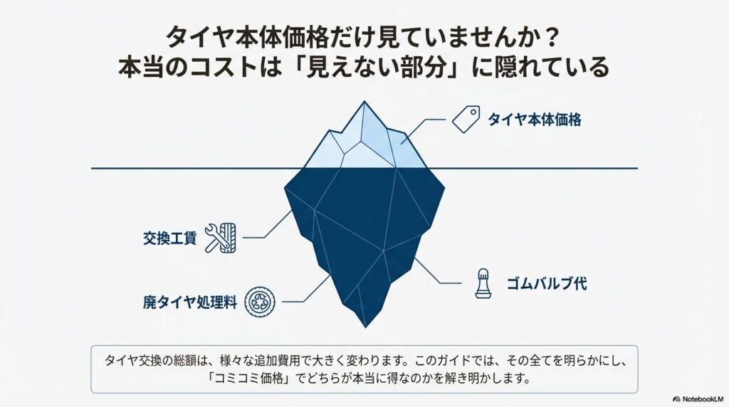 といった「見えにくいコスト」が複雑に絡んでくるため、単純なタイヤ本体価格の比較だけでは正解が見えにくいのが現状です。