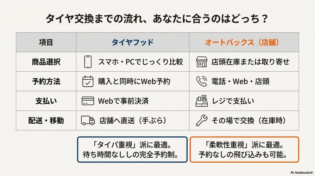 タイヤ交換までのプロセスも両社で大きく異なります。どちらが自分のライフスタイルに合っているか、以下の表で確認してみてください。