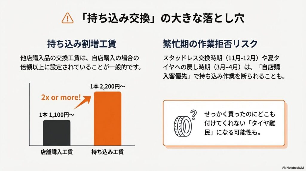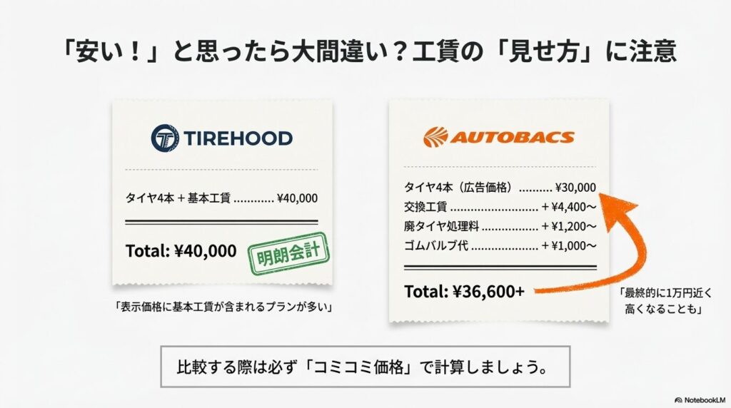 結果として、「タイヤ自体は数千円安く買えたけど、工賃が高すぎてトータルでは損をした」という失敗例が後を絶ちません。