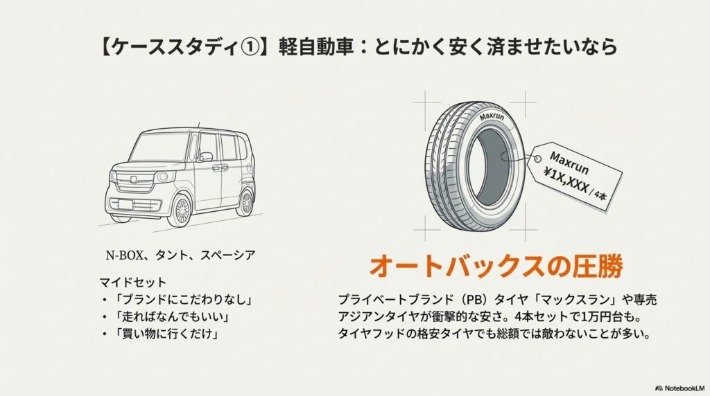 オートバックスの凄さは、なんといってもプライベートブランド(PB)タイヤの圧倒的な開発力と安さにあります。