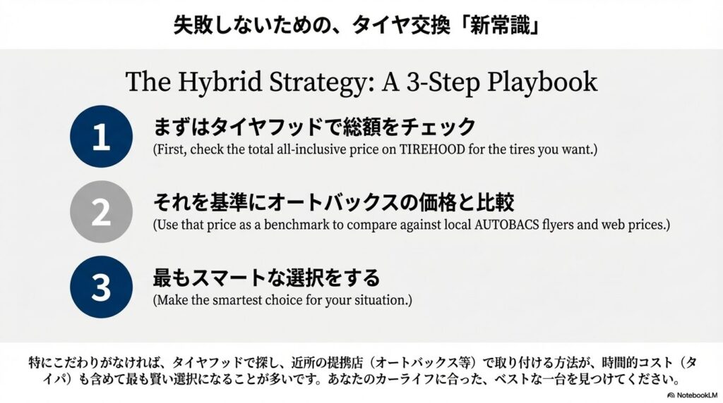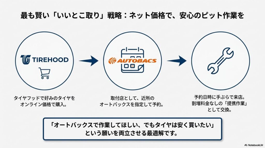 「オートバックスのピットで安心して作業してほしいけど、タイヤ価格はネットの安さを享受したい」という場合、タイヤフッド経由でオートバックスを予約するのが、最も賢い「いいとこ取り」の戦略と言えるでしょう。