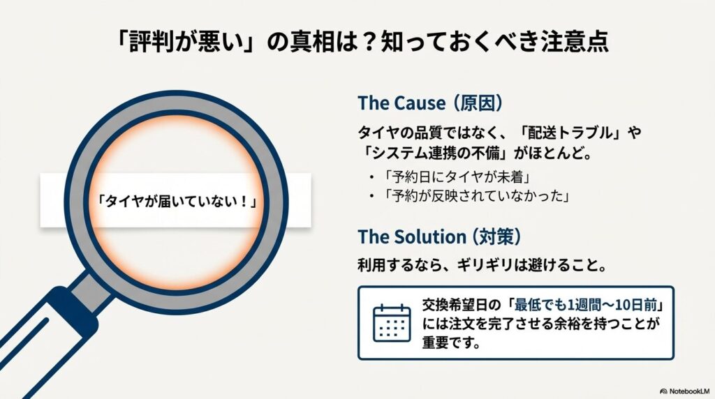 タイヤフッドの悪い口コミを詳しく分析すると、その多くはタイヤの品質そのものではなく、「配送トラブル」や「システム連携の不備」に起因するものです。
