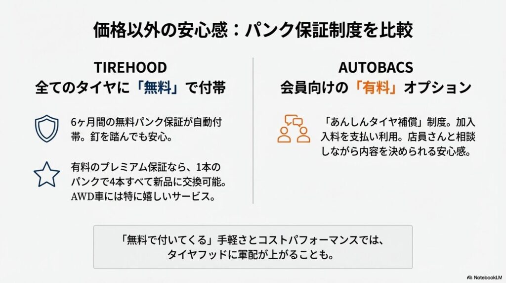 一方で、タイヤフッドには強力なメリットがあります。それが「6ヶ月間の無料パンク保証」です。