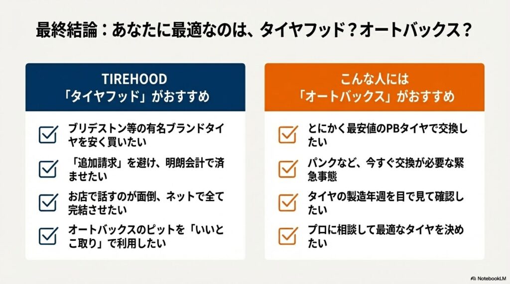 長くなりましたが、結局のところ「タイヤフッド オートバックス どっちが安い」のか、ケース別の結論をまとめます。
